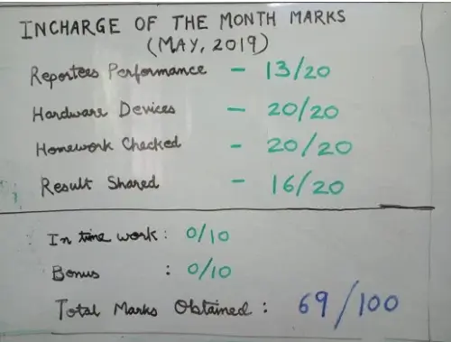 We made a system of ‘In charge of the month’ for teachers wherein each teacher is made to monitor others for a month or two. That particular teacher is our Point of Contact for all sorts of communications. The teachers are assigned scores based on their monthly performance.