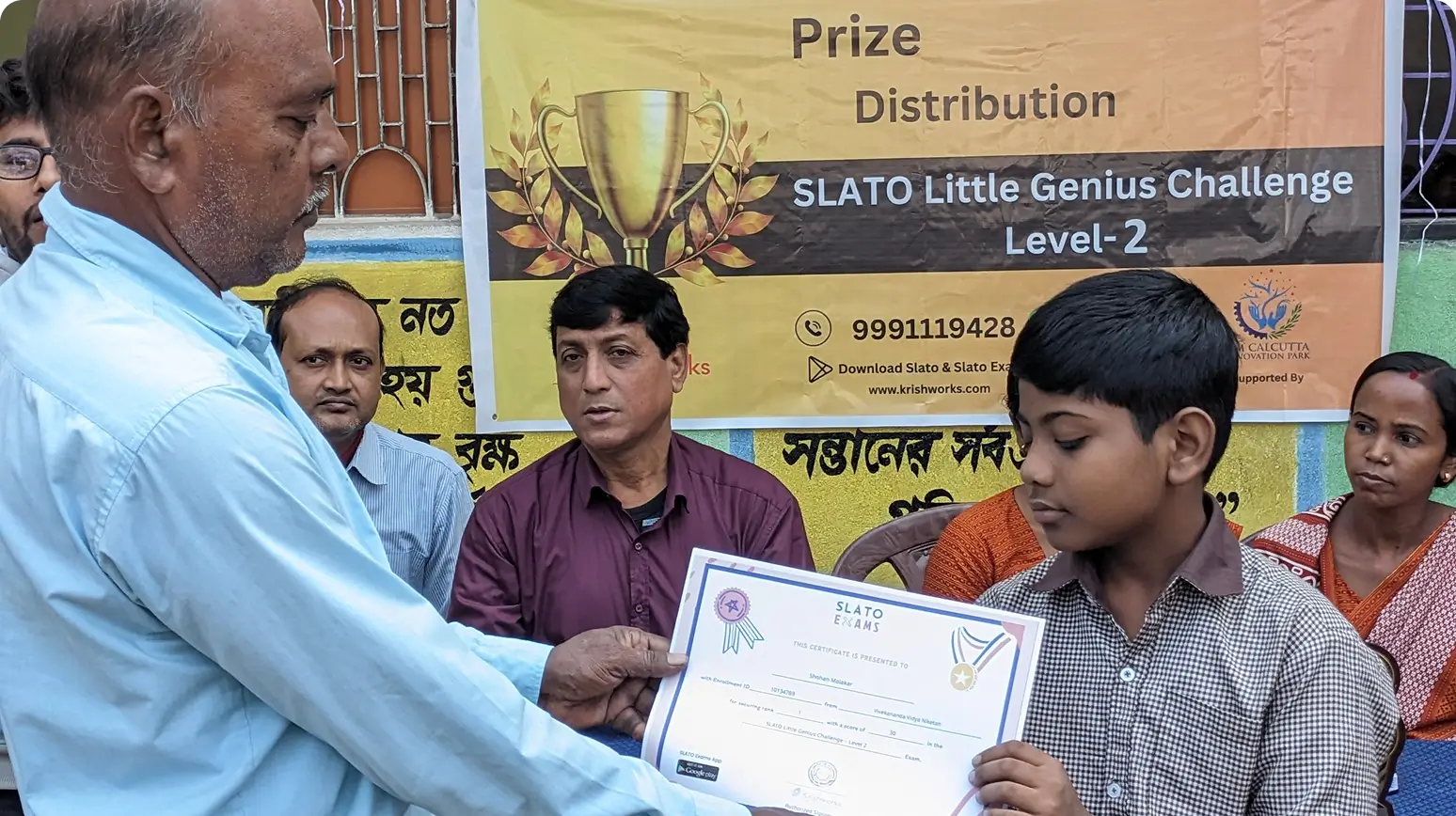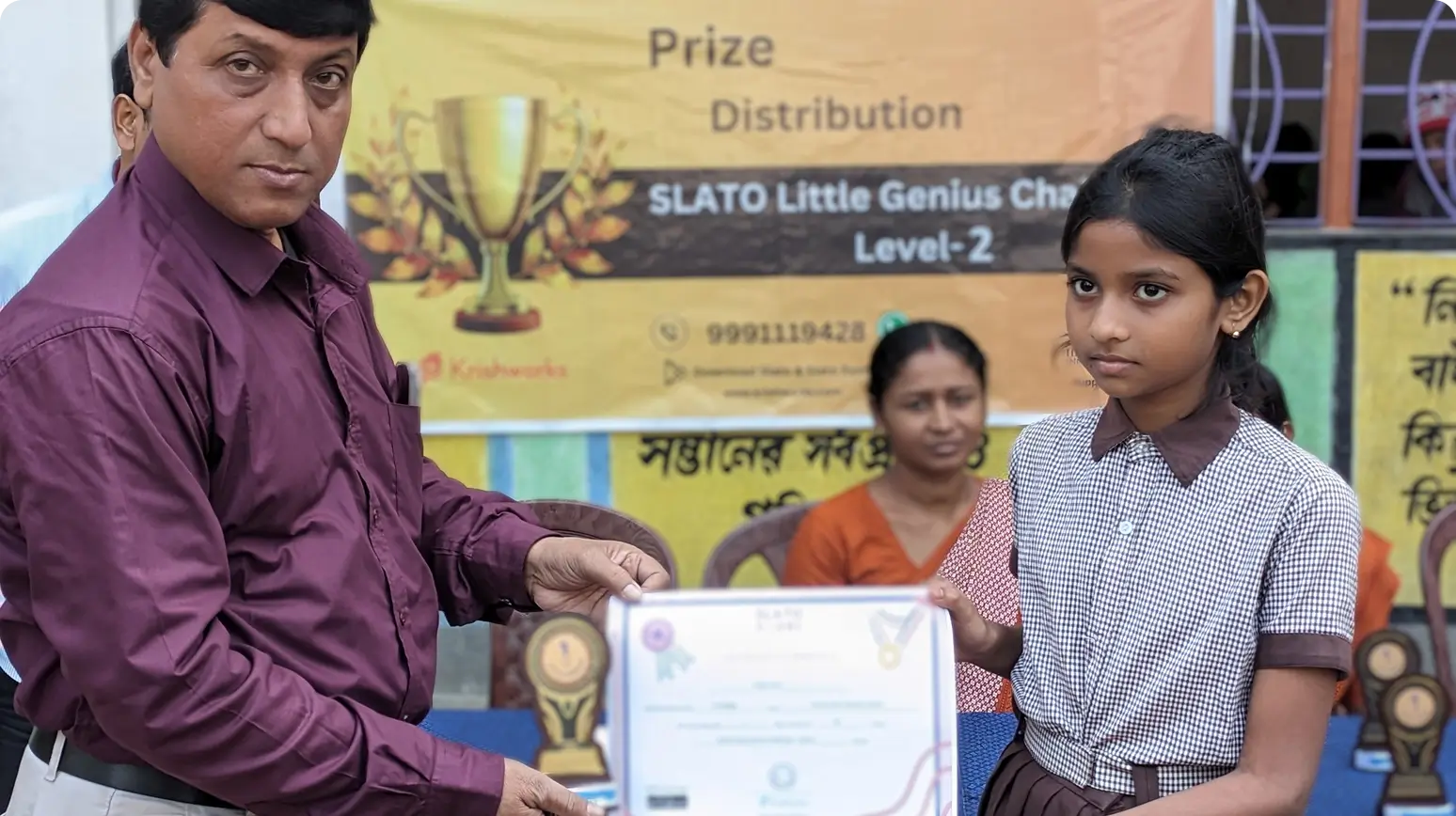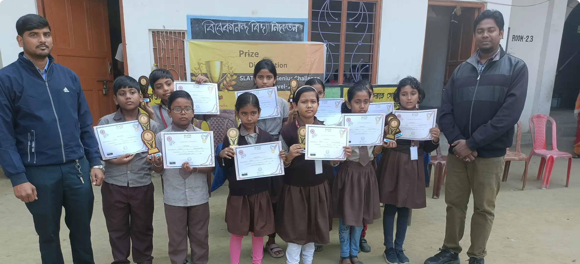 The prize distribution area was arranged with flags, certificates, and trophies. The school staff extended full support. A special mention goes to Mr. Subhajit Mandal, the smart class in-charge, who played a key role in student registration, exam coordination, and communication throughout the process.